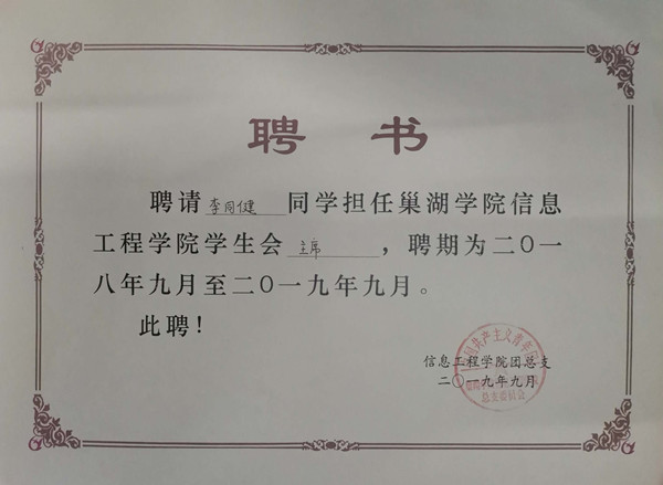 李同健,男,汉族,1999年2月生,安徽省淮北市相山区人,中共党员,信息工程学院17级计算机科学与技术1班学生,在校期间担任班级班长,学院学生会主席一职,在校期间曾获得校二等奖学金、优秀学生干部、优秀共青团干部、三下乡社会实践先进个人、优秀网宣员等荣誉。在2021年的研究生入学考试中,考入重庆交通大学材料与化工专业。
