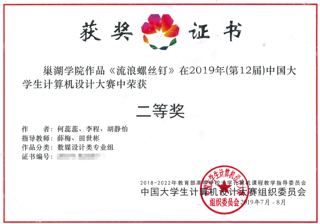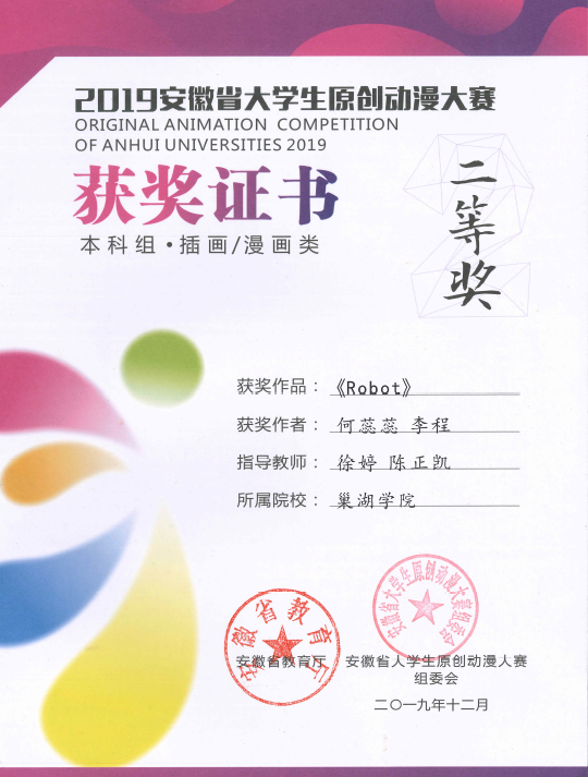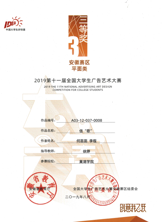何蕊蕊的大学四年是忙碌而充实的,在班级她担任了班长一职,此外,她还担任了院学生会生活部的副部长、院学生第二党支部助理等职务。四年间她的综合能力得到很大的锻炼和提升,但她始终没有忘记自己“学生”的身份。最让我钦佩的是除了理论知识的学习之外,她还学以致用,以赛促练,以赛促学,积极参加了各个级别的学科竞赛,并屡获佳绩。如第12届中国计算机设计大赛国赛二等奖、省赛二等奖,第11届、12届全国大学生广告艺术设计大赛省赛三等奖,2019安徽省大学生原创动漫设计大赛二等奖等;她还主持安徽省大学生创新创业项目1项、“皖维科技创新孵化基金”项目1项。在所有的比赛获奖证书中,出乎意料的是她个人特别看重的居然是一个学院级别的奖项——艺术学院秋季风景写生展一等奖,因为她深知良好的绘画功底是艺术设计的根本之所在。比赛也好,获奖也好,它们本身不是目的,归根到底它们的目的在于锻炼专业技能!