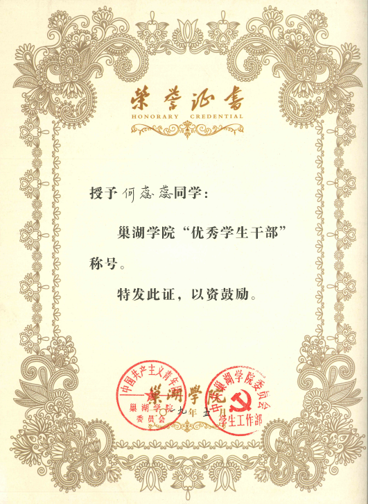 心怀祖国,积极进取,自信大方,懂得感恩这是我在何蕊蕊学姐身上看到的那些所获荣誉背后的根源所在。而这些品质正是两年的军旅生涯所带给她的,脱下迷彩,退伍回到巢院,她没有遗失这些东西,反而使它们在不同的地方更加发光发热了。