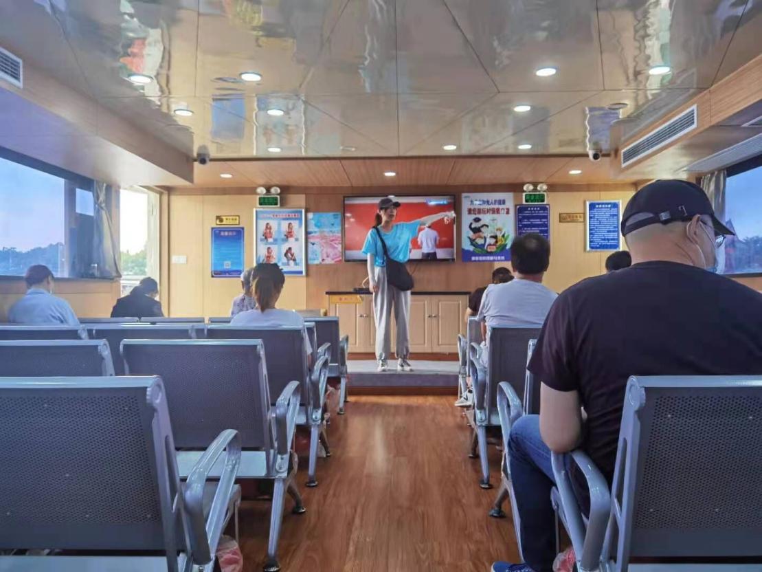夏日里,在前往姥山岛的游船上,船舱内游客兴致勃勃,郭文丽同学正为游客介绍五大淡水湖巢湖的历史发展、姥山岛渔村的由来,以及岛上文峰塔景点,游客们对姥山岛的地理环境、文峰塔建造和历史颇感兴趣,听的格外认真。
