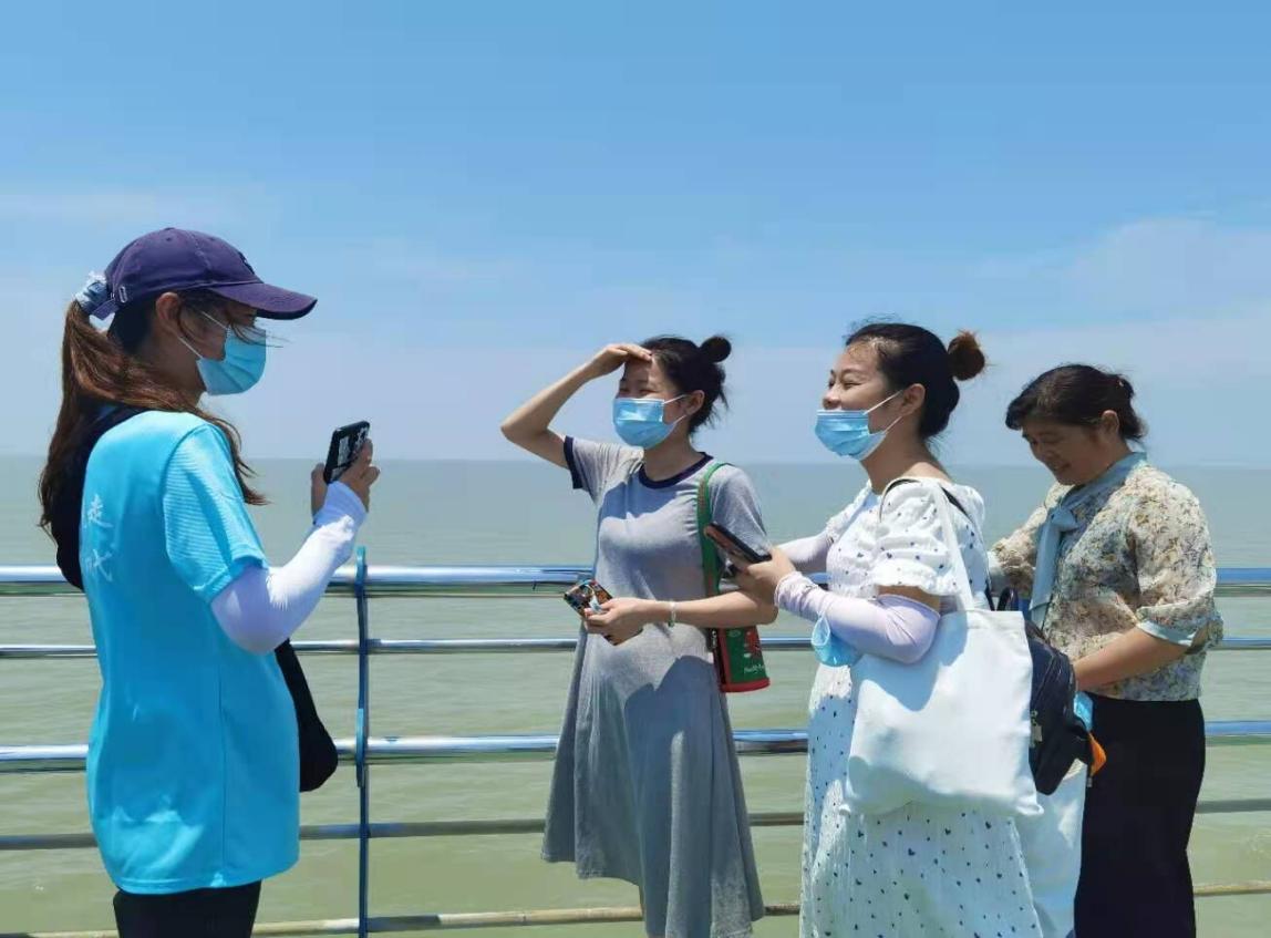 实践小组成员还带领游客们观望讲解了与姥山岛景区内的两座岛焦——鞋山与姑山,并给他们讲述了“陷巢州”的传说。