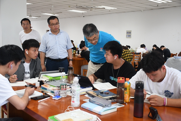 阮爱民首先来到图书馆自习室和博学楼教室,仔细了解同学们的考研复习情况,不时与同学亲切交谈,了解他们暑期学习计划,详细询问住宿和饮食情况,对刻苦备战考研学生表示问候。他希望同学们要遵守学校各项管理规定,做到劳逸结合,合理安排时间,掌握科学方法,注意防暑降温及人身安全,有困难及时向学校反映。阮爱民一行来到学校大门了解学生进出校园情况,深入学生宿舍查看学生宿舍的日常管理,了解阳光浴室的开放情况。阮爱民指出,同学们冒着酷暑,坚持勤奋复习,这种奋发图强、自强不息的上进精神令人敬佩,各有关部门要想学生之所想,把好事做好,把实事做实,尽最大努力保障同学们的学习生活条件,为学生免除后顾之忧。