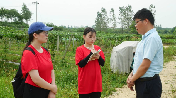 7月15日,调研团首先前往安徽省“一村一品”示范村黄麓镇跃进村开展调研工作,跃进村党委书记周先驷热情接待了调研团一行,在跃进村会议室,他向师生们详细介绍了村内的基本情况及近年来葡萄产业发展情况,他说道,“先前村民种植葡萄缺乏技术支持,只追求产量,缺乏创新,销量差。在村两委干部的不懈努力下,推陈出新,每年免费给农户引进新品种,聘请农业专家入村传授最新的套袋技术和修剪技术,坚持种植技术创新,保留葡萄的鲜美口感,提升葡萄品质和产量,种植户的年收入有了明显提高。现全村种植无公害葡萄400余亩,葡萄种植户多达200余户。”