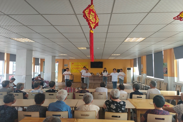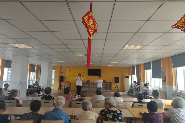 在7月16日上午8:30,团队成员举办了百花文艺汇演活动。活动伊始,小队成员在养老院负责人的带领下进入到了卧牛山养老院。在负责人的帮助下,准备好表演场地,并且将各位老人安排好了座位。之后,由各位成员依次上台表演,首先由小队成员周金艳带来歌曲《明天会更好》,吴浩男带来朗诵《永远跟党走》,韩梦圆与凌玲玲带来相声表演《买电脑》,张佳佳与王睿带来舞蹈《请先说你好》和歌曲《静悄悄》,志愿者们活泼的样子,给老人们带来了欢声笑语,最后全部成员上台表演了手语操《听我说谢谢你》。在活动中,团队成员与老人的距离越拉越近,在活动中感受到了老人的和善。本次活动的开展不仅增强了志愿者们的社会责任感,同时还向志愿者们弘扬了中华的传统美德爱老敬老,呼吁子女们要多多关心老人。