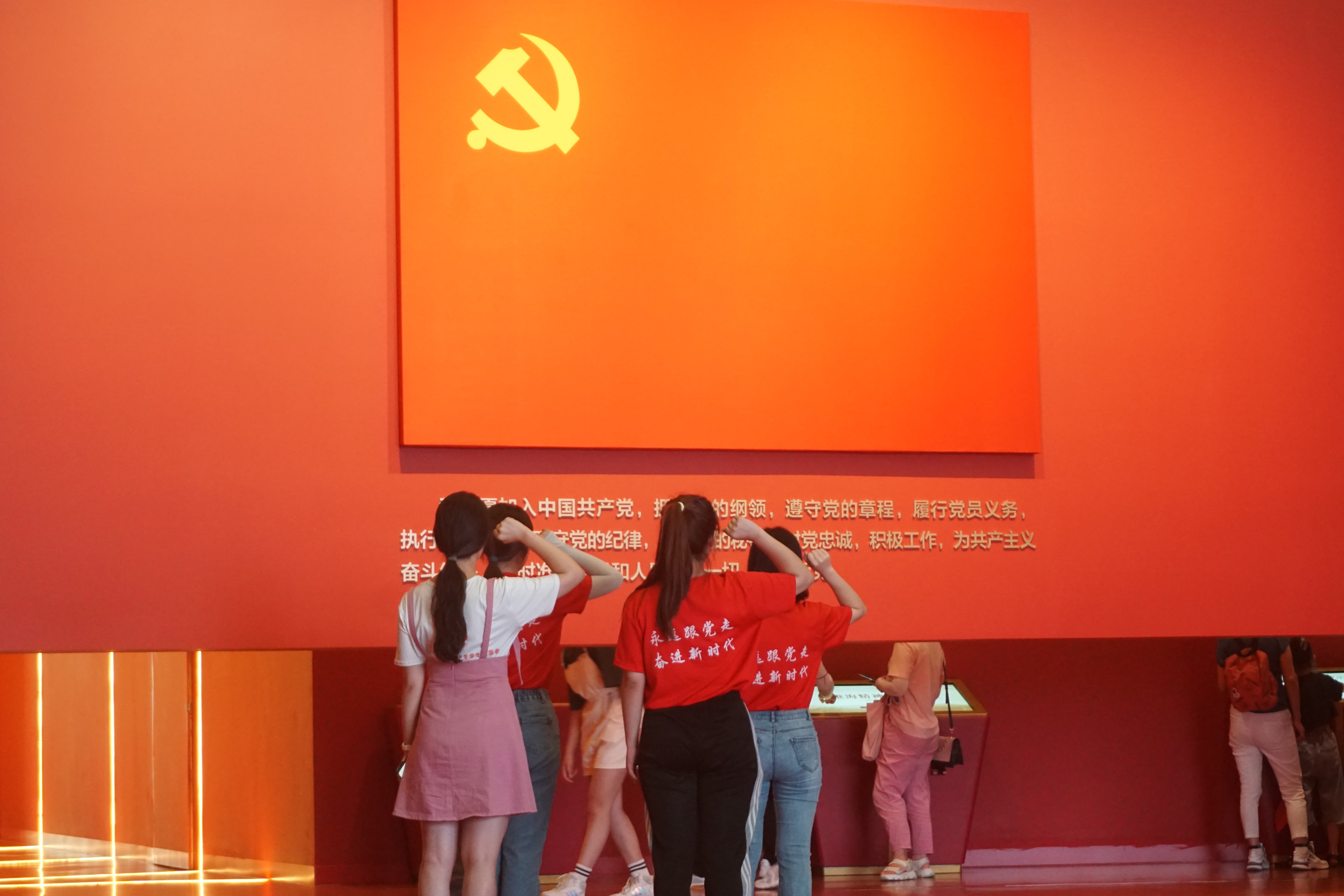 7月24日,实践团集体前往江苏省徐州市淮海战役纪念馆。随着纪念馆工作人员的讲解,成员们全面回顾了淮海战役的各个阶段和感人场景,“十人桥”的战士们为了部队的前进以身为桥,“人民的母亲”范大娘先后将三个儿子送进革命队伍,自己也投身于战争大后方,真正体会到淮海战役是人民的胜利。受此感召,在二楼展厅党旗前,队长陈思源带领团队中的党员举起右手,庄严宣誓,重温入党誓词。