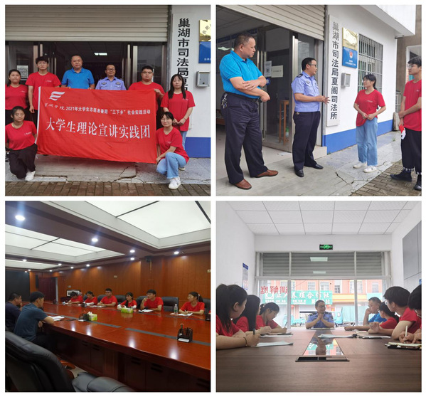 此外,团队还前往巢湖市人民法院、巢湖市司法所天河司法所、巢湖市夏阁镇司法所、三乐律师事务所进行采访和调研,就青少年犯罪、青少年法制教育等问题向专业人士进行咨询,为后期普法工作的开展提供了基础,他们也表示会在项目开展的过程中为团队提供相应的帮助。