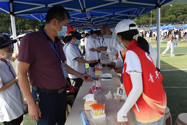 根据要求,全体师生员工佩戴好口罩按时来到集合点等待检测工作的开始。下午2:30,一切人员工作准备就绪,蓝色的大棚之间拉起红线组成临时的排队通道,身着红色马甲的志愿者们在绿色的操场上等待师生员工的到来。在工作人员的带领下,全体师生员工有序地进入采集点。午时的阳光却依旧残留着正午的燥热,志愿者们为医护人员搬来了冰块降温。检测过程中师生员工自觉守序,志愿者认真负责,医护人员严谨细致,现场核酸检测工作有条不紊地进行。