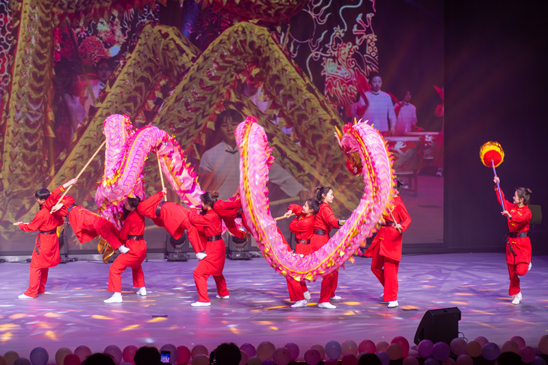 随后,晚会正式拉开帷幕。节目精彩纷呈,高潮迭起。开场舞《龙腾狮跃贺新春》以欢快的节奏和生动的表演瞬间点燃了现场气氛。体育舞蹈《舞动乾坤》、朗诵《体育颂》、歌曲《如愿》等节目轮番上演,充分展示了体育学院师生们的才艺和风采。特别是歌曲《如愿》,以其深情的旋律和真挚的歌词,表达了对先辈奋斗与奉献的敬仰和对美好生活的期盼,赢得了现场观众的阵阵掌声。在“体育传承”篇章中,武术表演《国武雄风》、“一院一镇一品”特色节目—快板《校地共谋新篇章》和舞龙表演《彩龙舞东方》等节目,不仅弘扬了中华传统文化,还展现了体育精神的传承与发扬。在“强国有我”篇章中,歌曲《开始懂了》、小品《突如其来》、体育舞蹈《繁星》和体育专项表演串烧《最好的舞台》等节目,以不同的形式展现了青年学子的朝气蓬勃和爱国情怀。