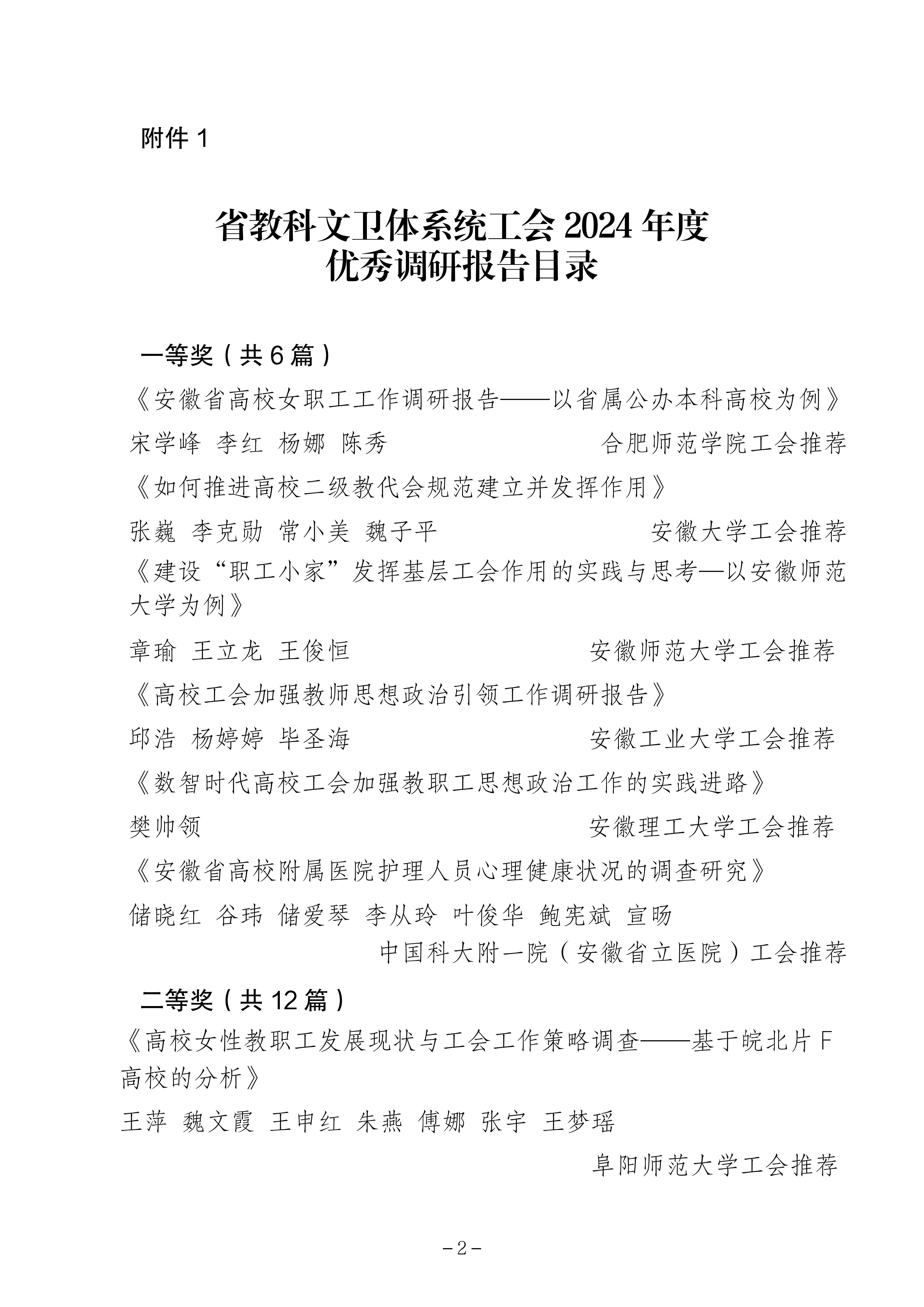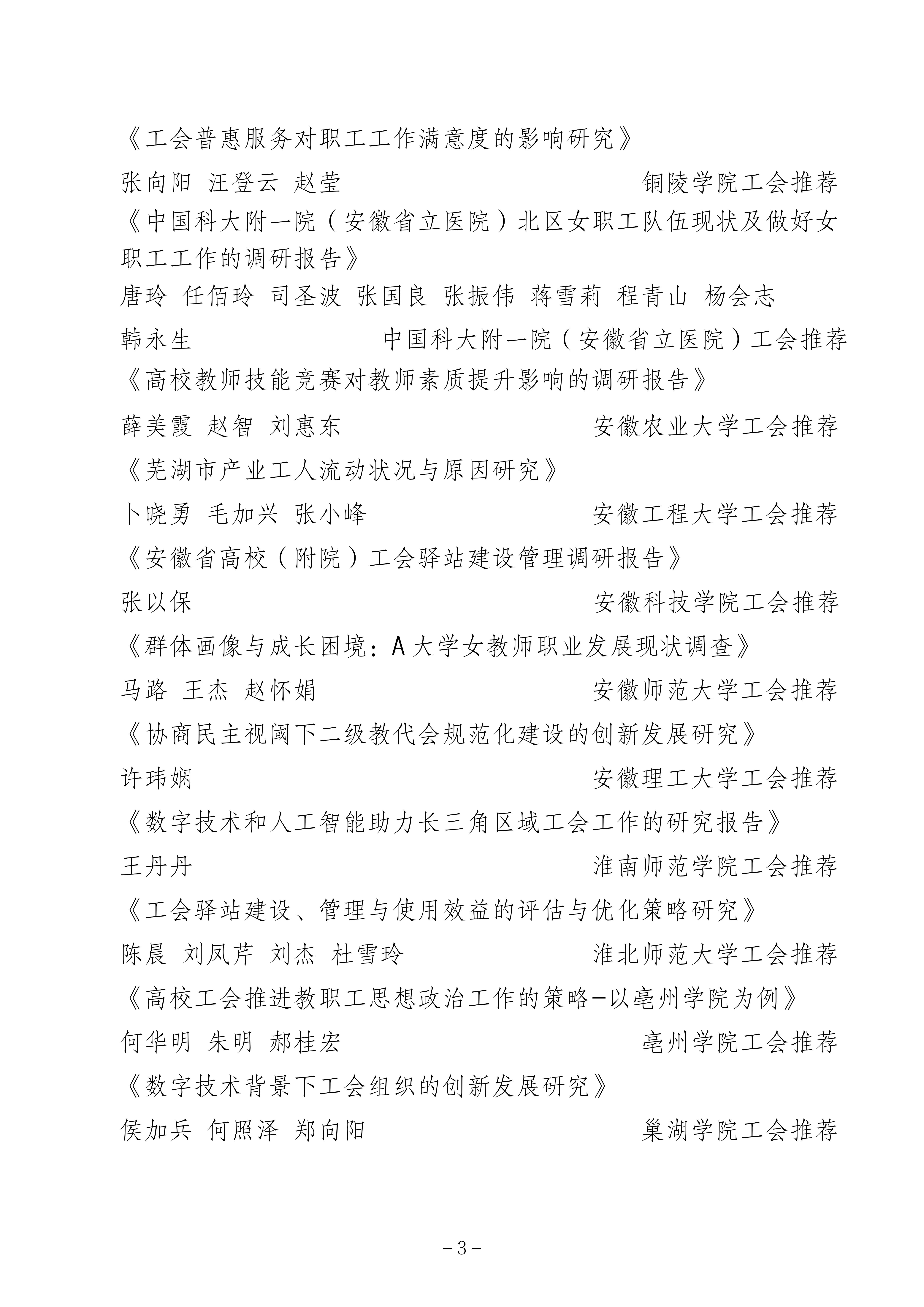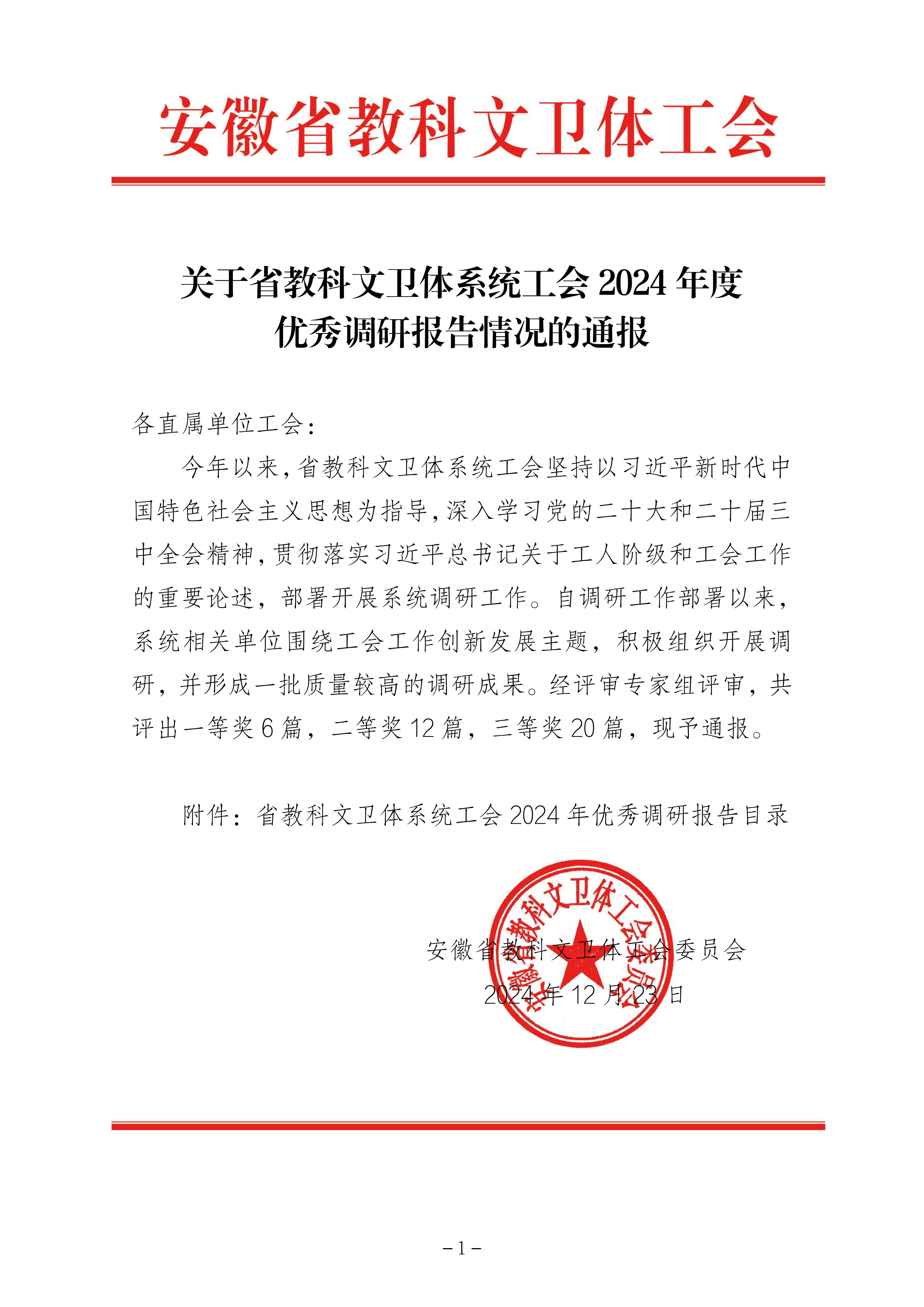 近日,2024年度安徽省教科文卫体系统工会调研报告评选结果公布,我校推荐的侯加兵、何照泽、郑向阳的《数字技术背景下工会组织的创新发展研究》荣获二等奖,为学校赢得了荣誉。