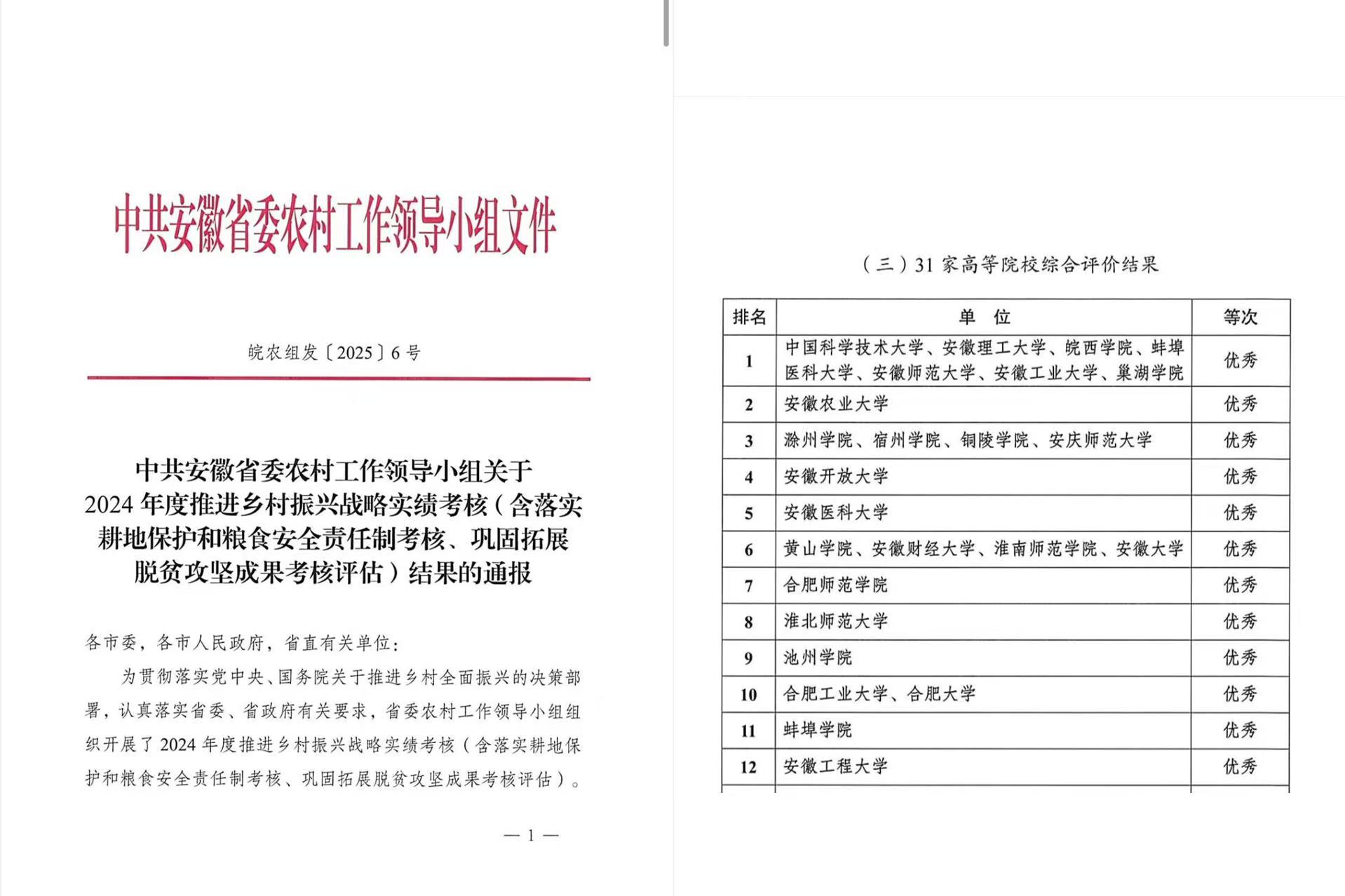 近日,安徽省2024年度推进乡村振兴战略实绩考核(含落实耕地保护和粮食安全责任制考核、巩固拓展脱贫攻坚成果考核评估)结果公布,awc777万象城娱乐官网获得安徽省2024年度推进乡村振兴战略实绩考核(巩固拓展脱贫攻坚成果考核评估)优秀等次,与中国科学技术大学、安徽理工大学、皖西学院、蚌埠医科大学、安徽师范大学、安徽工业大学等6所高校并列第一。