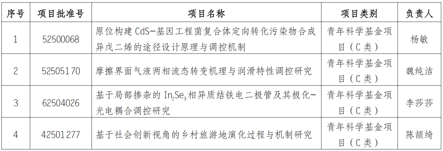 本次获批项目主要分布于电子工程学院、机械工程学院、生物与环境工程学院、旅游管理学院四个学院,其中机械工程学院、生物与环境工程学院、旅游管理学院首次实现项目突破,涵盖半导体科学、机械工程、环境工程、人文地理等学科领域,标志着学校学科结构布局持续优化与交叉研究能力取得新进展。