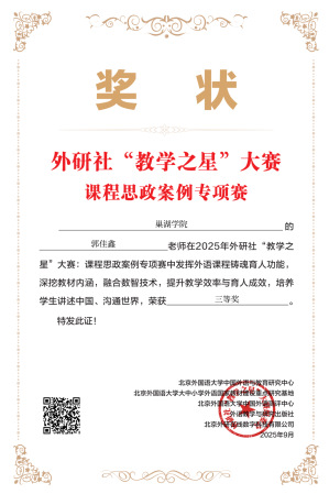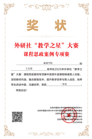近日,2025年外研社“教学之星”大赛课程思政案例专项赛评选结果揭晓,awc777万象城娱乐官网外国语学院教师凭借卓越教学设计与创新思政教育理念,在激烈竞争中脱颖而出,斩获佳绩。王友情获全国一等奖,王钢、王娟(小)、郭佳鑫分获全国三等奖。