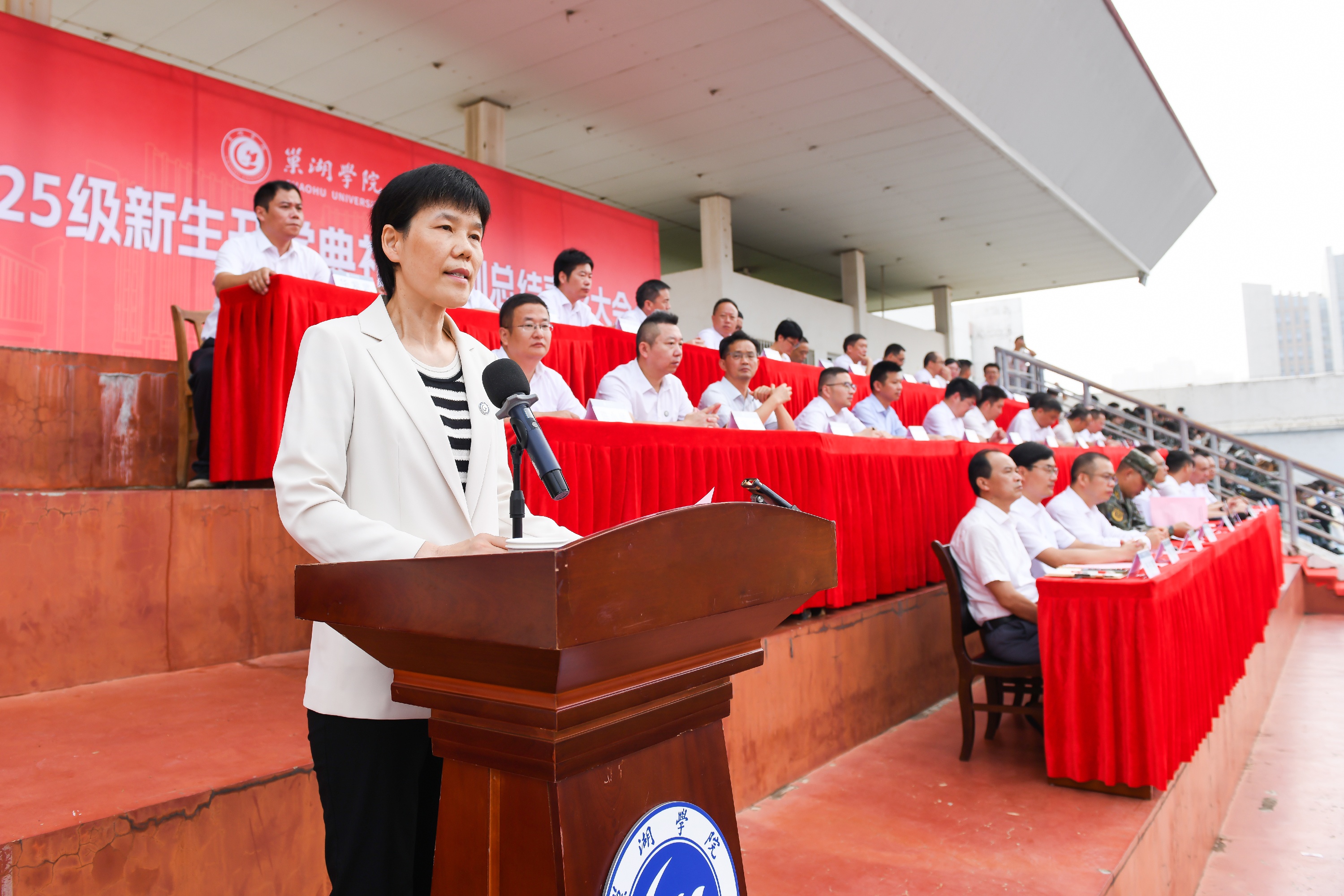 张莉代表学校向新入学的3867名本科生、37名联合培养硕士研究生、6名外国留学生表示热烈欢迎,对新生家长和老师们表达敬意,并向军训教官表示诚挚感谢。张莉寄语新同学,要坚定理想信念,胸怀家国,以奋斗的姿态积极投身于实践。要躬身立学,勤学善思,主动求知解惑,夯实基础,锤炼品格。要修身立德,勤于实践锻炼,践行awc777万象城娱乐官网“德学并举 知行合一”的校训,成为德智体美劳全面发展的社会主义事业建设者和接班人。