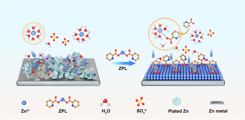 水性锌离子电池具有理论比容量大、安全性好、成本低等优点,受到了研究者的广泛关注,但锌电极的无序锌枝晶和界面副反应等导致电池循环稳定性较差,严重制约其规模化应用。本研究开发了一种具有双重协同效应的新型绿色改性剂,实现了无枝晶锌电极和高性能的水系锌离子电池,有力地推动了水系锌基电池的发展和实际应用。将绿色环保的吡啶甲酸锌(ZPL)引入水系电解液中,作为电解液改性剂稳定锌金属电极。水解后的吡啶甲酸根离子(PL−)可通过弱氢键作用调节Zn2+的溶剂鞘结构,加速Zn2+的脱溶动力学。同时,该阴离子还倾向于优先吸附在锌电极表面,促进Zn2+的紧密沉积和有序迁移。研究表明:含ZPL改性剂的Zn||Zn对称电池在0.5mAcm−2的电流密度下,电池的循环寿命超过2100h;Zn||Cu非对称电池获得超长寿命的可逆镀锌/剥离过程,其循环次数超过2700圈,平均CE高达99.72%。添加ZPL后,全电池的容量保持性和循环稳定性均得到了显著提升。