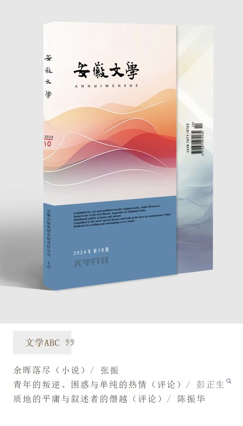 彭正生教授、陈振华教授在《安徽文学》2024年第10期分别发表题为《青年的叛逆、困惑与单纯的热情》《质地的平庸与叙述者的僭越》的评论文章。