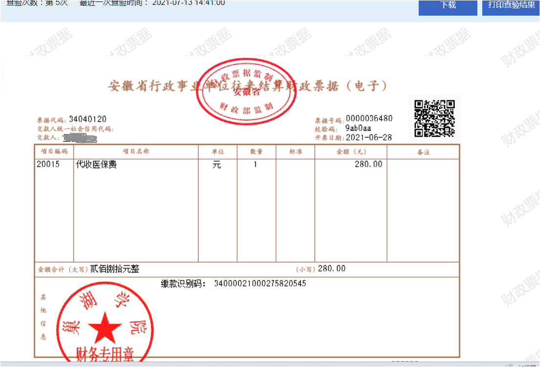 6.进入安徽财政电子票据公共服务平台后,选择“缴款码查验”,输入“缴款码”,和“随机码”,点击“查验”按钮。