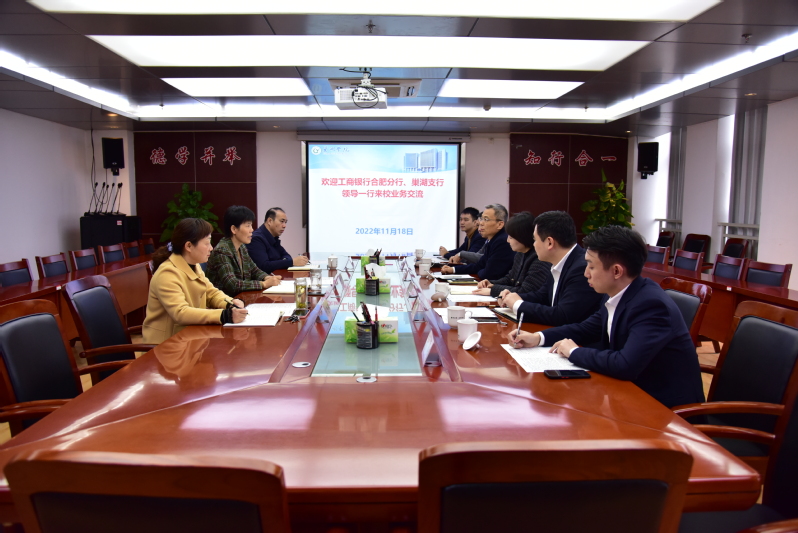 11月18日上午,中国工商银行合肥分行行长苑卫东、副行长许含芝以及巢湖支行行长丁恒等一行来我校洽谈银校合作事宜。院长张莉主持会议,副院长丁俊苗、财务处处长刘亚平参加座谈。
