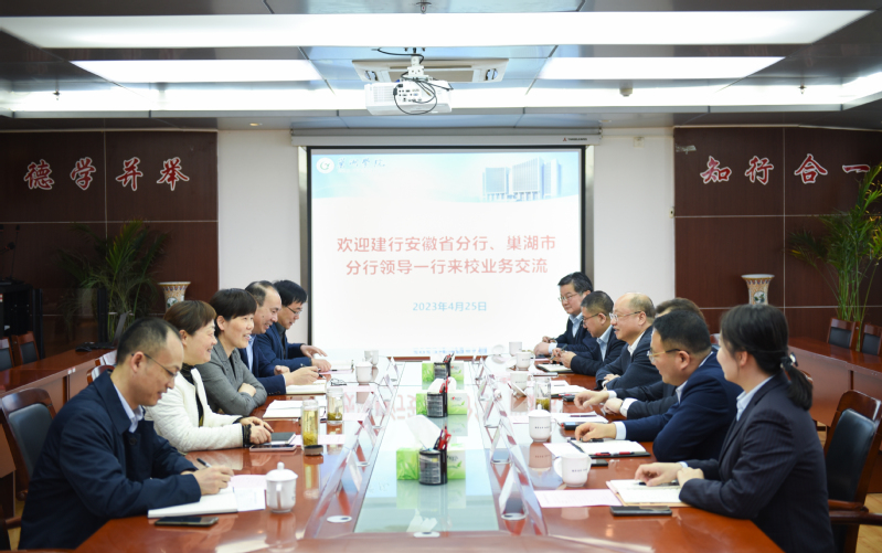 4月25日上午,建行安徽省分行党委书记、行长邹致师等一行来我校洽谈银校合作事宜。校党委副书记、校长张莉主持座谈会,党委委员、副校长丁俊苗,财务处、国资处、信息化处主要负责人参加座谈。