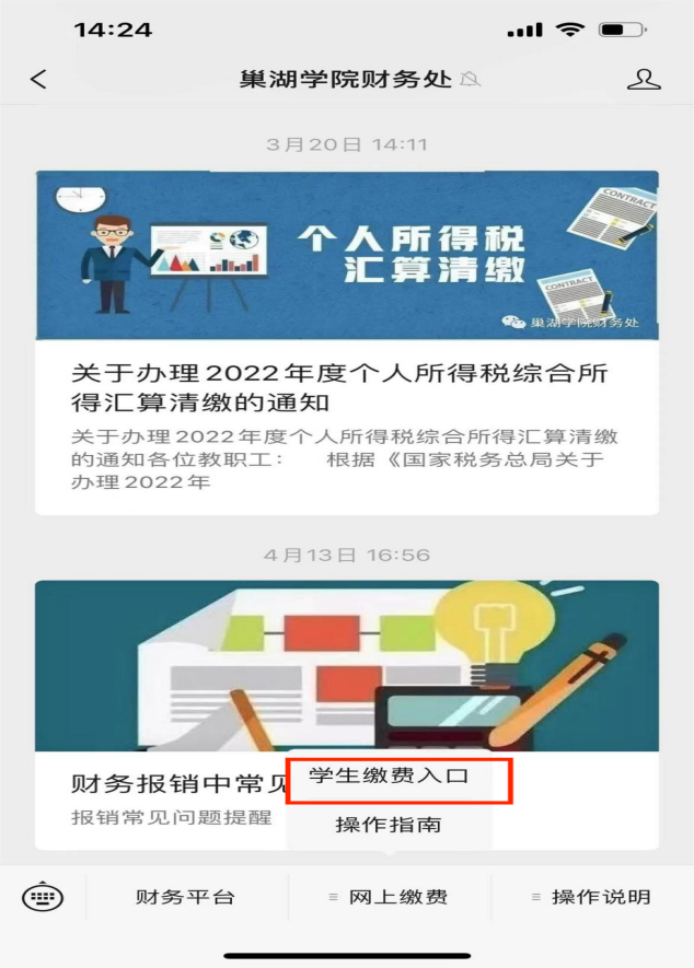 第二步:进入公众号后,点击“网上缴费”栏,选择“学生缴费入口”栏目。