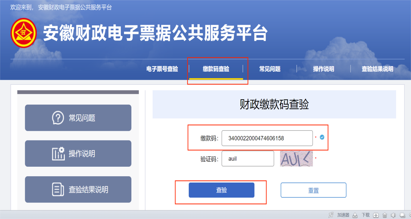 第二步:电脑登录http://czpj.ahzwfw.gov.cn:8888/。点击“缴款码查验”,输入“缴款识别码”、“验证码”后,点击查验,票据出现后直接下载打印即可。