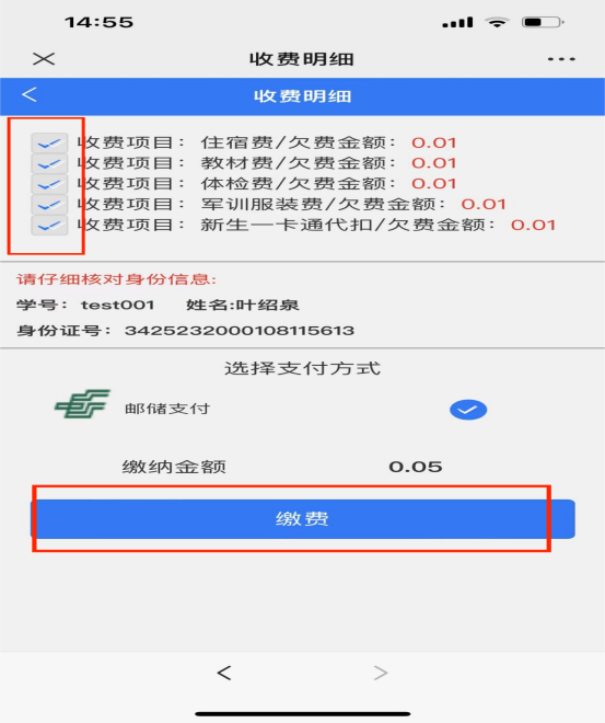 第一步:缴费前仔细核对姓名、身份证号(如有误,请联系老师更正后进行缴费)。