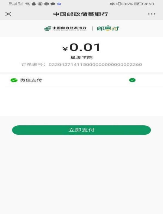 第五步:进入“中国邮政储蓄银行”支付页面后,点击“立即支付”按钮。输入微信支付密码即可支付完成,显示支付成功。(目前仅支持微信支付)