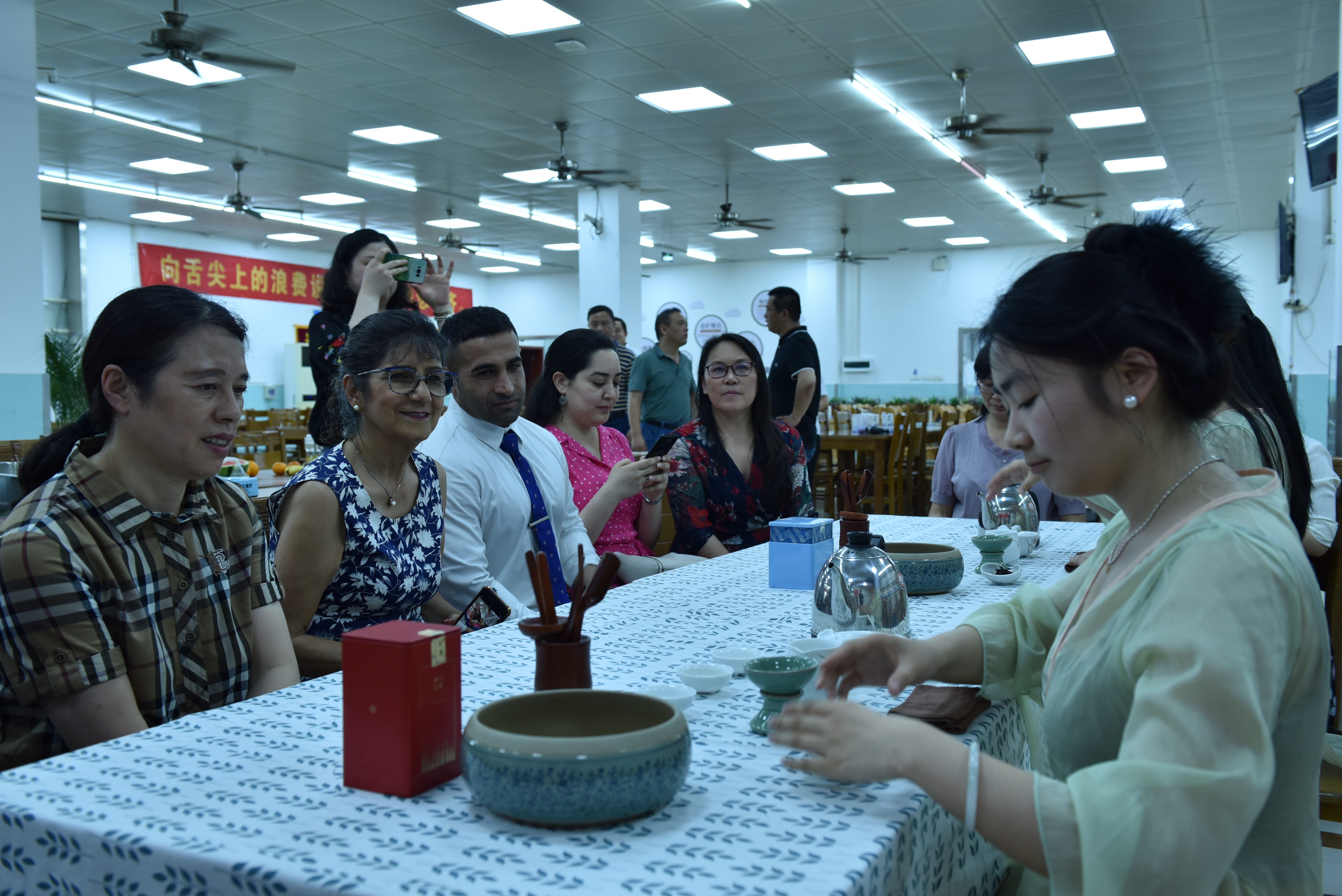 活动过程中与会人员首先观看了旅游管理专业同学们的茶艺表演,一杯杯香茗在四位身着汉服的同学手中经过置茶、冲泡、奉茶,让中外宾客品尝到了绿茶的清香、红茶的醇厚,对中华茶文化有了更深刻的体验和理解。接着,外教们在食堂师傅的指导下,一边饶有兴趣地用绿绿的粽叶包裹起粽子,一边聆听端午节习俗的文化来源。交流活动上,中外师生还一起学做传统挂件—香囊,在穿针引线之间,一个个散发不同香芬、秀气的香囊新鲜出炉,香气浓郁。