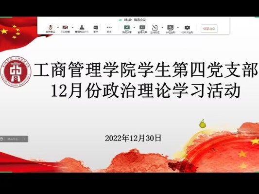 为缅怀江泽民同志的丰功伟绩和崇高风范,不断提高学生党员的思想觉悟和政治素养,工商管理学院学生第四党支部于12月30日晚在线上开展十二月政治理论学习活动。本次活动由工商管理学院学生第四党支部书记任洁指导,学生党员王闪闪主持,全体党员共同参加。