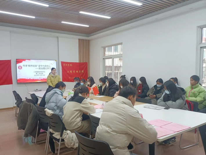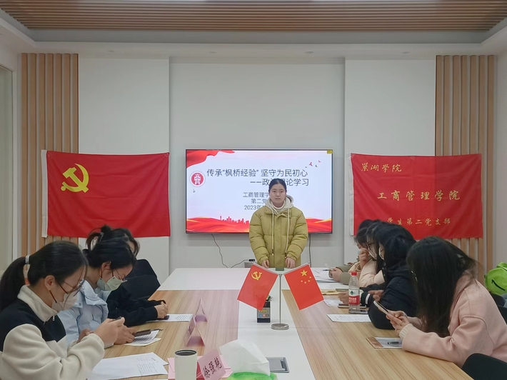 为坚持和发展好新时代“枫桥经验”,坚守以人民为中心的根本立场,工商管理学院学生第二党支部于12月13日下午在巢有范党员服务站开展“传承‘枫桥经验’,坚守为民初心”政治理论学习活动。本次会议由党支部副书记徐强艳主持,工商管理学院学生第二党支部全体党员参加。