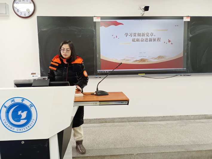 党章是党的根本大法,是全党必须遵循的总规矩。党课开始,任洁针对党的二十大当中对党章的部分修改内容向学生党员进行深入讲解,其中特别提到各位学生党员要针对其修改内容进行深入学习。接着,她介绍了党章的百年演变,她表示党章的百年演变突出体现了时代性、把握规律性、富有创造性,体现了中国共产党人的探索与创新。随后,她指出各位学生党员要争做合格党员,优秀党员,真真切切地做到“讲政治,有信念”、“讲规矩,有纪律”、“讲道德,有品行”、“讲奉献,有作为”。最后,她对本次党课学习进行了总结,表示各位学生党员要在日常工作中坚守初心,甘于奉献,敢于担当 ,不懈奋斗,为实现中华民族的伟大复兴贡献出自己的一份力量。