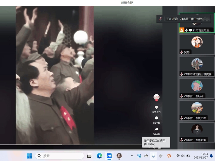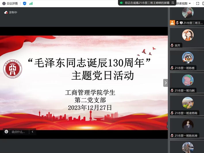 为了表达对毛泽东同志的深切缅怀和敬意,加强党员对毛泽东思想的学习和理解,传承和弘扬毛泽东思想的精神实质,工商管理学院学生第二党支部于12月27日下午五点通过腾讯会议开展“毛泽东同志诞辰130周年”主题党日活动。此次党日活动由工商管理学院学生第二党支部副书记徐强艳主持,工商管理学院学生第二党支部全体党员参加。