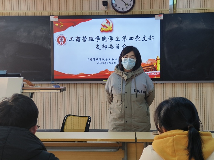 为积极落实本月党支部具体工作安排,分配好工作职责,工商管理学院第四党支部于2024年1月5日下午在博学楼516教室召开本次支部委员会,本次会议由党支部书记任洁主持,学生第四党支部支部委员会成员参与。