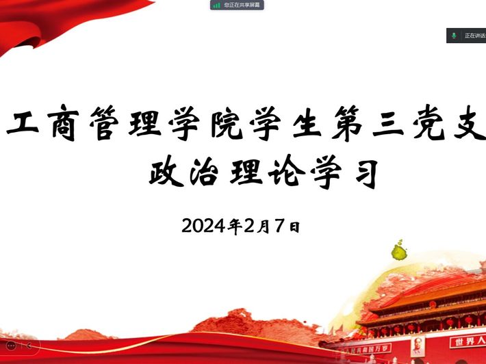 为加强党员思想教育工作,增强党性修养,工商管理学院学生第三党支部于2月7日下午在线上开展二月份政治理论学习。本次会议以学习习近平总书记对政法工作作出重要指示精神为主题,工商管理学院学生第三党支部书记刘国主持,全体党员参与。