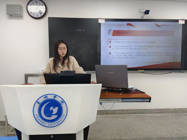 首先,储岚霖采用趣味问答的方式带领全体党员回顾了全国两会的应知应会,包括召开时间、职能、代表产生方式等,再一次加深了大家对全国两会的了解。接着,储岚霖向大家介绍了2024全国两会的新词热词,如“新三样”“新质生产力”“投资中国”等,储岚霖详细地阐释了它们。随后,储岚霖提到,来自各行各业的代表、委员们积极为国家发展建言献策,发出了有力量、有温度的“好声音”,比如“加强全民美育”“推广全民阅读”等。在当今社会,随着时代的不断发展,人才培养机制也要不断完善,储岚霖希望在座学生党员能够不断加强自身的党性修养,多实践,多阅读,不断丰富阅历、开阔眼界,成为全面发展的人才,不断助力党的事业持续向前发展,成为实现中华民族伟大复兴梦的圆梦人。同时,储岚霖就今年两会期间谈到的关于青年就业问题向大家提出倡议,希望在座的学生党员能够做好自己的职业生涯规划,不打没有准备的仗,有计划有步骤地稳步向前,树立正确的就业观和择业观。最后,储岚霖结合学校发展总结到,学校一直致力于建设应用型本科高校,组建高素质专业化教师队伍,坚持教育优先发展,培养“德学并举,知行合一”的高素质人才,展望2024,希望在座党员能够发挥好先锋模范作用,为学校的发展和建设添砖加瓦。