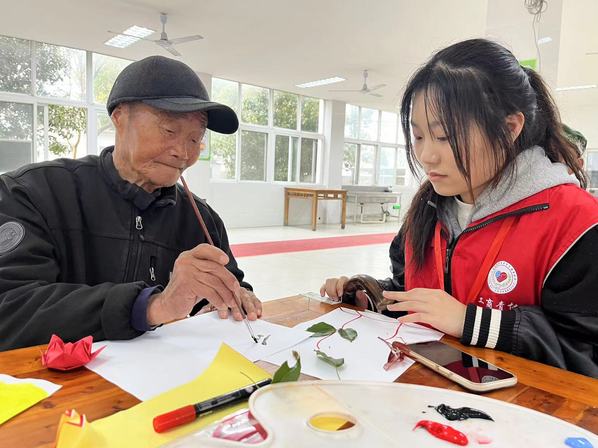 早上七点,参加活动的党员在图书馆门口准时集合。在负责人清点人数后,全员乘坐公交车抵达夏阁镇第三敬老院。活动前,党员们认真布置活动会场,摆放活动用品,并热情邀请老人参加创意画、写书法等活动,在与老人互动的同时,也能感受到他们积极开朗的生活态度。活动中,党员们来到一位老人家中拜访,交流中发现老人很喜欢书法,墙壁上挂满了他的书法作品,虽已是鲐背之年,但在论文学经典时,亦能侃侃而谈,他用书法文字表达了对祖国对党的热爱之情,党员们也纷纷表示对他的敬佩。参观过后,成员们在食堂为就餐老人表演手势舞,并在表演后细心地教在场老人简单的手势动作,传递手指灵动的乐趣。活动后,党员同志们临行前在老人宿舍外帮忙除去墙边杂草,搬走碎石,保障老人出行安全,并与老人热情告别并合影留念。