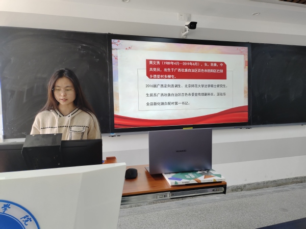 首先,学生党员孙海幸表示本期分享的人物是“大山的女儿”——黄文秀。接着,孙海幸从个人简介、主要经历、人物评价等方面向我们介绍了全国优秀党员黄文秀的先进事迹。黄文秀同志生前是广西壮族自治区百色市委宣传部干部,从北京师范大学研究生毕业后,积极响应组织号召,到乐业县百坭村担任驻村第一书记,埋头苦干,带领88户418名贫困群众脱贫,全村贫困发生率下降20%以上,却在从百色返回乐业途中遭遇山洪不幸遇难,献出了年仅30岁的宝贵生命。随后,孙海幸向我们分享了黄文秀绘制的白坭村“贫困户分布图”,每一户的住址、家庭情况、致贫原因等都被详细标注。学生党员谷翔宇表示黄文秀的故事鼓励我们要树立终身学习的理念,不断提升自己的能力和素质,激励我们要热爱祖国,积极投身于建设家乡和祖国的伟大事业中。最后,支部书记储岚霖对本次活动作出总结,黄文秀同志自觉践行党的宗旨,始终把群众的安危冷暖装在心间,带领群众发展多种产业,为村民脱贫致富倾注了全部心血和汗水,用美好青春诠释了共产党人的初心使命,谱写了新时代的青春之歌,我们要以黄文秀同志为榜样,不忘初心、牢记使命,勇于担当、甘于奉献。