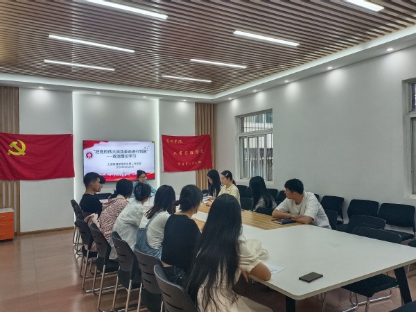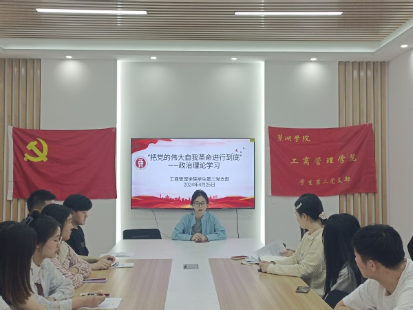 为加强党支部建设,提高学生党员的政治素质和思想觉悟,工商管理学院学生第二党支部于4月24日下午在巢有范党员服务站开展“把党的伟大自我革命进行到底”政治理论学习活动。此次会议由辅导员李梦雨主持,工商管理学院学生第二党支部全体党员共同参加。