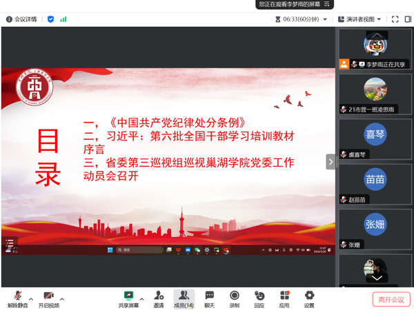 首先,李梦雨指出,作为一名大学生党员,首先要在思想上同党中央保持高度一致。维护党中央集中统一领导是具体的而不是抽象的,要落实到坚定维护党中央权威上,落实到增强“四个意识”、坚定“四个自信”、做到“两个维护”的实际行动上。随后,由吴齐、王婷婷分享自己对于此次学习的心得感悟。吴齐表示,新时代以来,党的理论创新和实践创新是十分生动的,我们的学习也应该是生动的。此次学习反映了新时代的创新成果,展示了我们党推进和拓展中国式现代化的生动实践。王婷婷表示,领导班子全面贯彻巡视工作方针,旗帜鲜明把“两个维护”作为根本任务,聚焦新时代新征程党的使命任务,紧盯权力和责任,紧盯“一把手”和领导班子,紧盯群众反映强烈的问题,紧盯巡视整改和成果运用,着力查找和纠正被巡视党组织履行职责中的政治偏差和突出问题,充分发挥政治巡视利剑作用。最后,李梦雨对本次会议进行了总结。希望各位党员同志能够进一步加强学习,认真学习党章、党纲,争做一名合格的共产党员。