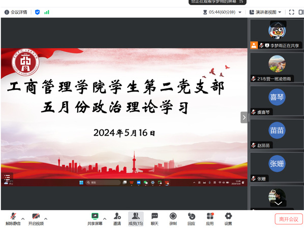 为深入学习贯彻习近平新时代中国特色社会主义思想,进一步引导支部党员同志提高党性修养,践行初心使命,工商管理学院学生第二党支部于5月16日上午十点通过腾讯会议开展五月份政治理论学习活动。此次会议由辅导员李梦雨主持,工商管理学院学生第二党支部全体党员共同参加。