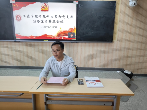 5月16日,工商管理学院学生第六党支部在博学楼513教室召开党员大会,讨论夏月星等5位预备党员转正事宜。大会由支部书记葛晓龙主持,工商管理学院学生第六党支部全体党员参加。