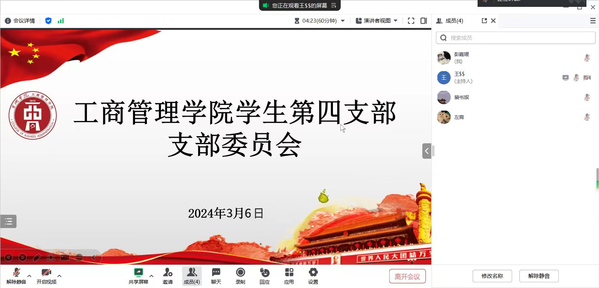为深入研究党支部自身建设和党员教育管理,工商管理学院学生第四党支部于3月6日下午在线上开展党支委会。本次会议以加强党支部建设为主题,工商管理学院学生第四党支部书记任洁主持,党支委成员全员参与。