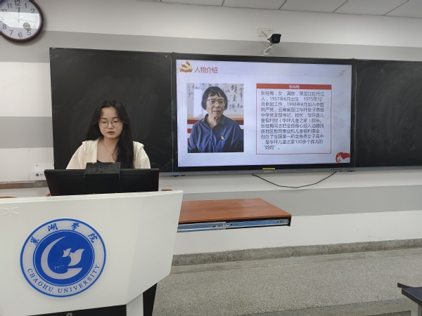 学生党员黄宸表示本期分享的人物是“燃灯校长”——张桂梅。接着,黄宸从人物介绍、主要事迹、主要荣誉等方面详细介绍了全国优秀党员张桂梅的先进事迹。张桂梅,扎根贫困地区40余年,创办全国第一所全免费女子高中,连续12年送考,帮助1800多名贫困山区女孩圆梦大学,是为教育事业奉献一切的“张妈妈”。她探索形成“党建统领教学、革命传统立校、红色文化育人”特色教学模式,用红色基因树人铸魂,拖着病体忘我工作,持续12年家访超过1600户,行程11万余公里。随后,黄宸向我们分享了关于张桂梅老师的视频。从这个视频中,我们可以看到,张桂梅老师用的、穿的也极为简朴。有时一个馒头就是她的一餐早饭,一碗面条就是她的午餐和晚餐。张桂梅一直用自己生命在帮助这些孩子,即使自己遭受病痛折磨,手上都贴满了膏药,忍着痛也要坚持下去。