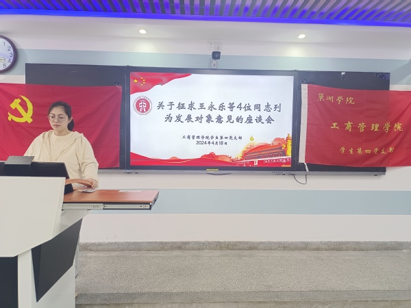 为促使党支部蓬勃发展,工商管理学院学生第四党支部于4月18日下午在博学楼504教室召开党内外群众座谈会。本次会议由学生第四党支部书记任洁主持,主要听取党内外群众关于王永乐等4名入党积极分子是否列为发展对象的意见,支部相关学生党员和班级学生代表参会。