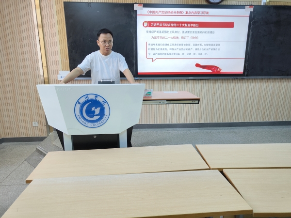 课上,葛晓龙表示学习《中国共产党纪律处分条例》的重要性,《中国共产党纪律处分条例》是党内法规的重要组成部分,是全体党员必须遵守的行为准则。随后,葛晓龙从条例的内容、特点、意义等方面进行了详细解读,并结合实际案例进行分析。他要求全体学生党员要牢记党的纪律和规矩,自觉维护党的团结和统一,不断提高自我约束和自我净化能力。最后,支部党员进行了热烈的交流和讨论。大家纷纷表示,通过学习《中国共产党纪律处分条例》,更加深刻地认识到了党的纪律和规矩的重要性。同时,大家也表示要自觉践行党的纪律和规矩,做到言行一致、表里如一。