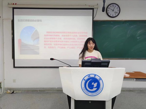 首先,储岚霖介绍了本次政治理论学习的主题是“党史上的生活纪律建设”和“党员组织关系应如何转接”。接着,学生党员王虹雨带领我们从生活作风、生活规矩和生活方式三个方面学习了党史上的生活纪律建设,并表示党的生活纪律是党员在日常生活和社会交往中应当遵守的行为规则,涉及党员个人品德等各个方面,关系党的形象。作为学生党员,我们要在学习和工作上起到先锋模范作用,还要坚持从生活小事小节中加强修养,完善自己,严以律己。随后,学生党员曹慧琳运用图解的方式向我们介绍了党员组织关系应如何转接,并强调党员组织关系是指党员对党的基层组织的隶属关系,每个党员都必须编入党的一个支部、小组或者其他特定组织。现在正值毕业季,毕业生党员应及时做好党员组织关系转接工作。最后,储岚霖对本次活动作出总结,她表示党的生活纪律对于党的长远发展和党员个人修养都具有至关重要的意义。作为一名合格的党员,应当深刻理解生活纪律的重要性,将其内化为自己的行为习惯,并规范组织关系转接程序,确保每位党员都能正常参加组织生活。