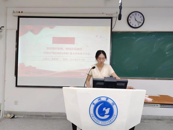 储岚霖详细介绍了《中国共产党纪律处分条例》修订的原因及意义,并强调《条例》是新时代党的纪律建设的重要成果,体现了中国共产党坚持和完善中国特色社会主义制度、推进国家治理体系和治理能力现代化的决心。讲授过程中,储岚霖重点解读了《中国共产党纪律处分条例》的修订内容,并指出新《条例》对违反“六大纪律”的行为进行了详细规定,为党员干部的行为提供了明确的界限。这有助于党员干部树立正确的世界观、人生观、价值观,自觉抵制各种不良风气,做到清正廉洁。最后,储岚霖作出总结,她表示《条例》的修订和完善,有助于推动党内法规体系的构建,提高依规治党和党规党纪意识,确保党的建设和决策部署得到有效实施。学生党员石林表示在此次《条例》学习的过程中深感其内涵丰富、意义重大,各位学生党员必须以身作则,严格遵守《条例》,牢记自己的职责和使命。