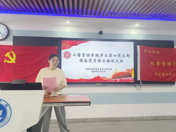 为进一步落实党员发展工作,壮大党员队伍,工商管理学院学生第四党支部于5月17日下午在博学楼413教室召开预备党员转正大会。本次会议由工商管理学院学生第四党支部书记任洁主持,对陈媛媛等10位同志是否接收为正式党员进行讨论和表决,支部全体党员参加。