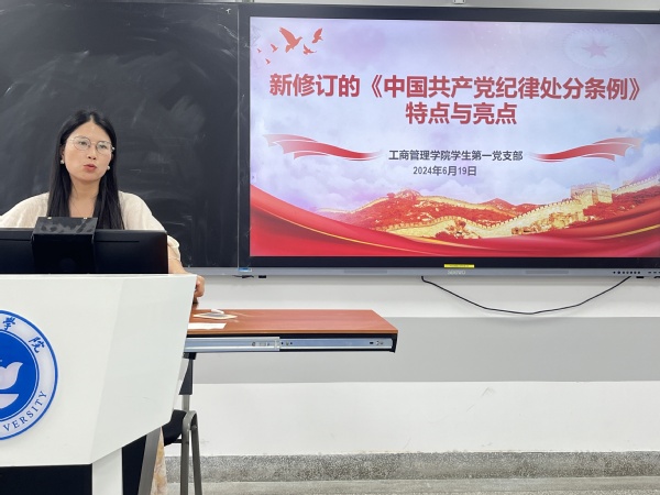 为进一步强化纪律意识、加强自我约束、提高免疫能力,深刻理解《中国共产党纪律处分条例》的精神内涵,工商管理学院学生第一党支部于6月19日中午,在博学楼415教室召开学习新修订《中国共产党纪律处分条例》专题党课。本次党课由工商管理学院学生第一党支部书记许沙主讲,学生第一党支部全体成员参加。