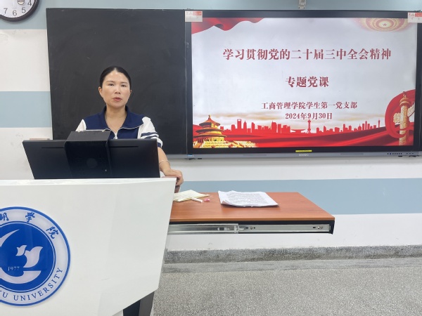 为深入学习贯彻党的二十届三中全会精神,进一步统一思想、凝聚力量,工商管理学院学生第一、二党支部于9月30日中午博学楼410教室开展“党的二十届三中全会精神”专题党课。本次党课由学生第一党支部书记许沙主持,学生第一、二党支部全体党员参与。