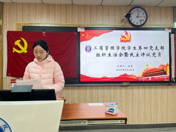 为组织和落实党员开展民主评议,工商管理学院学生第四党支部于2月26日下午在博学楼516教室召开组织生活会暨2024年度民主评议党员工作。此次会议由党支部书记任洁主持,党委副书记金晶、辅导员李梦雨列席,学生第四党支部全体成员参加。